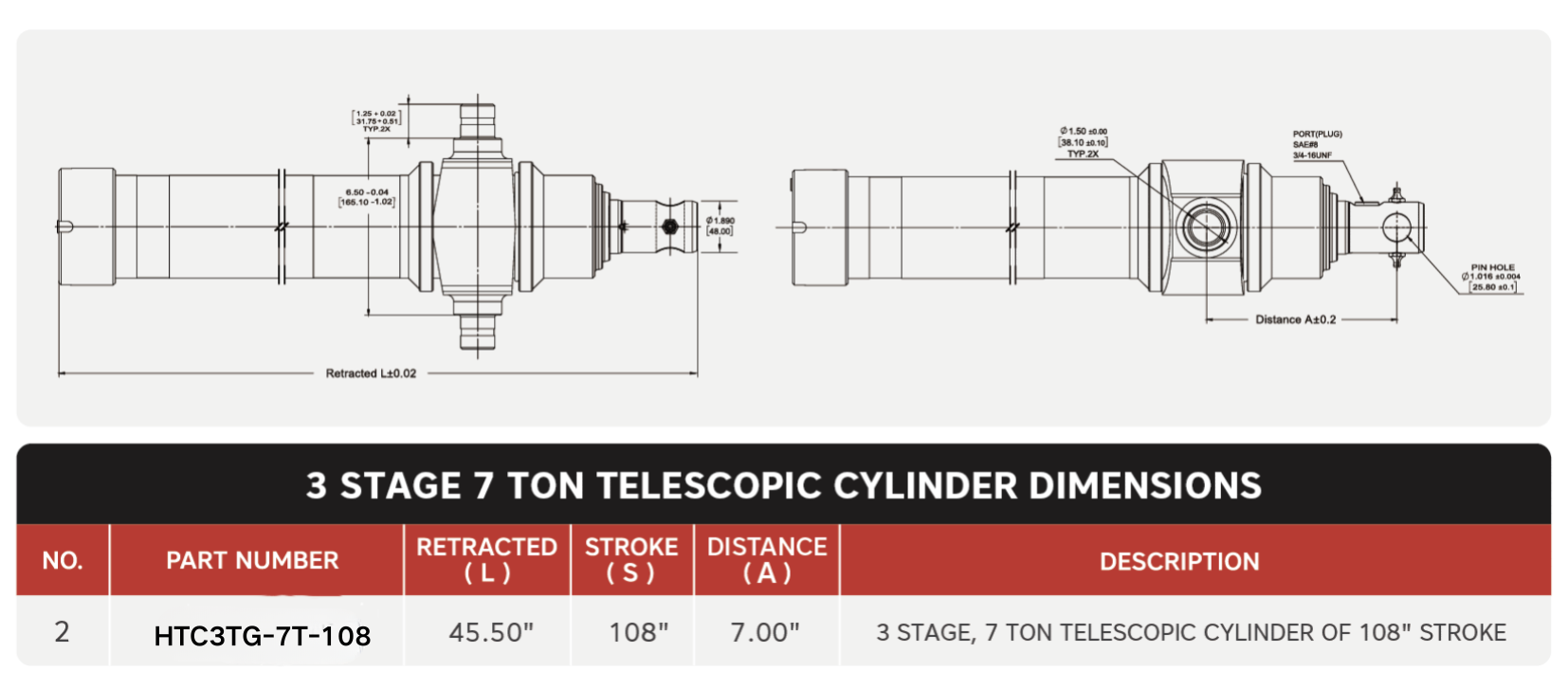 "HTC3TG-7T-108", 3단, 7톤 108" 스트로크 텔레스코픽 실린더